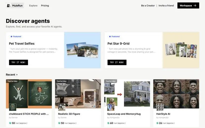 9 月 16 日,全球首个 AI Agent 交易市场 MuleRun (骡子快跑)正式上线,面向所有用户开放使用。 MuleRun 的 Logo 是一个像素风骡子,平台上集合了不同类型的多个 Agent 。