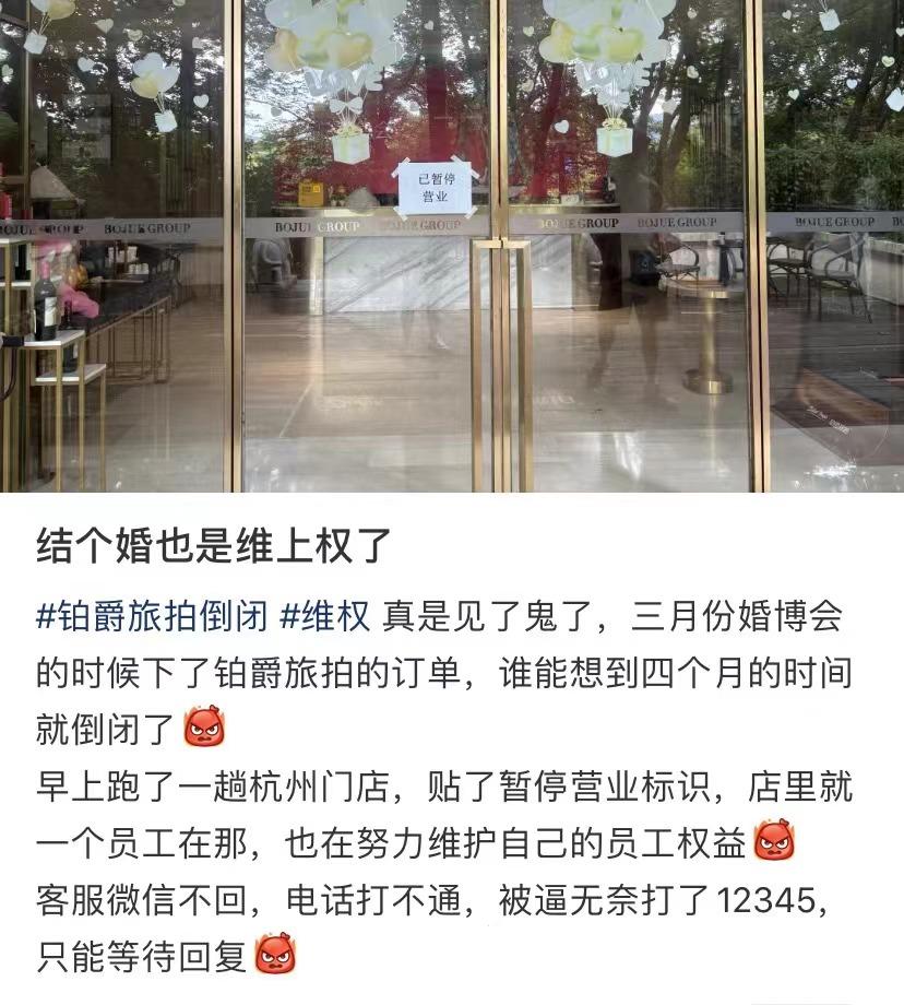 “铂爵旅拍的第一批受害者出现了”在社交平台上,网友“小汤圆”发布笔记称,自己曾在婚博会上给铂爵旅拍交了八千余元的定金,但婚期将至,准备约拍时却得知了铂爵旅拍倒闭的消息,“点进去才知道七月底,(铂爵旅拍)老板就卷钱跑路了,惊得我立马给客服发消息,果不其然无人回应。好在销售比较负责,指导我找了婚博会办理转拍手续……”