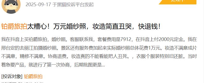 在黑猫投诉上,在铂爵旅拍倒闭潮之前,有不少消费者投诉铂爵旅拍的原因是对效果或服务不满意,其中有消费者提到,“婚纱照五次修图不满意,客服态度不好”。