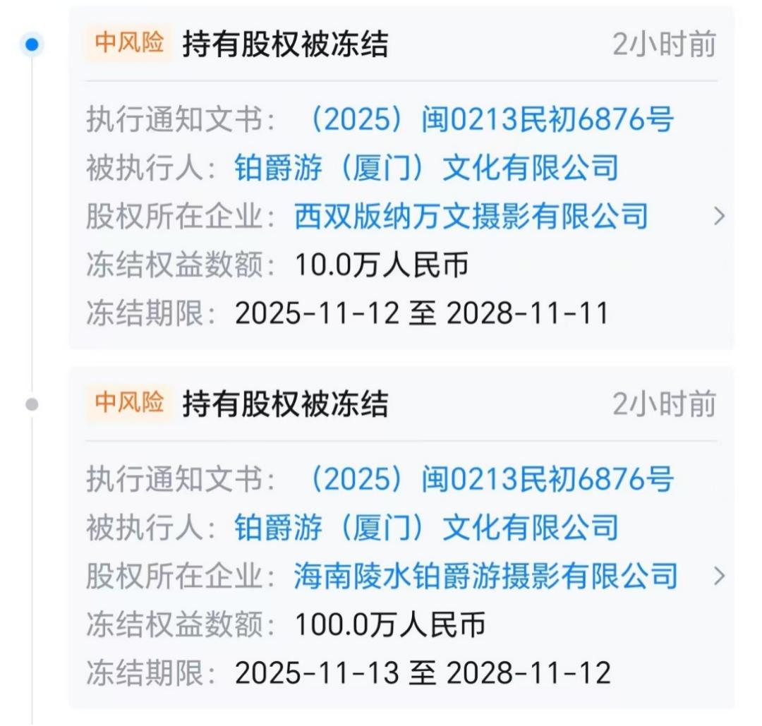 天眼查APP显示,近日,铂爵游(厦门)文化有限公司新增两则股权冻结信息,股权所在企业分别为海南陵水铂爵游摄影有限公司、西双版纳万文摄影有限公司,冻结股权数额合计110万元,冻结期限均为3年,执行法院均为福建省厦门市翔安区人民法院。而在此之前,铂爵旅拍董事长许春盛等人新增一则被执行人信息,执行标的1.75亿余元。