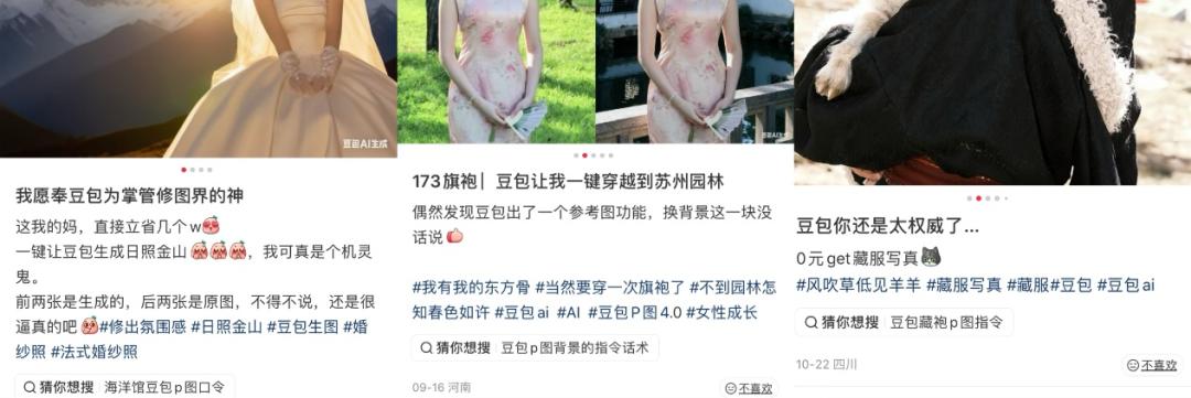 此外,通过豆包等AI图片生成软件,即便足不出户,也能生成大量不同背景的“美照”。在小红书等社交平台上,有不少网友分享了自己利用AI软件生成的旅行图,从以日照金山为背景的婚纱图,到怀抱小羊的藏服写真,从一键穿越至苏州园林,到零成本拥有浪漫法式洱海旅拍照……如此种种,也就不难理解网友为何感慨,“有了AI,谁还花钱去旅拍”“打开AI,立省几千”。