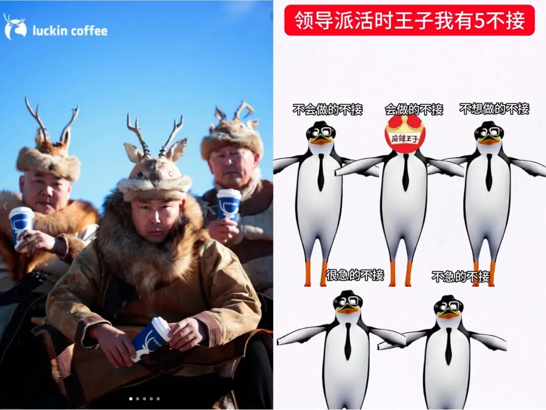 不久之前,三位鄂伦春族大哥因狍皮帽在机场走红,网友们纷纷玩梗其形象酷似瑞幸logo,并纷纷@品牌官方。此后,瑞幸迅速行动,发布与鄂伦春族大叔的合作,并前往鄂伦春自治旗拍摄了一支广告大片;最近,3D高雅企鹅在社交平台上爆火,“不愿错过一个梗”的麻辣王子,则以企鹅为主角,趁势发布了一支魔性短视频:“领导派活我有‘五不接’——不会做的不接、会做的不接、不想做的不接、很急的不接、不急的不接。”