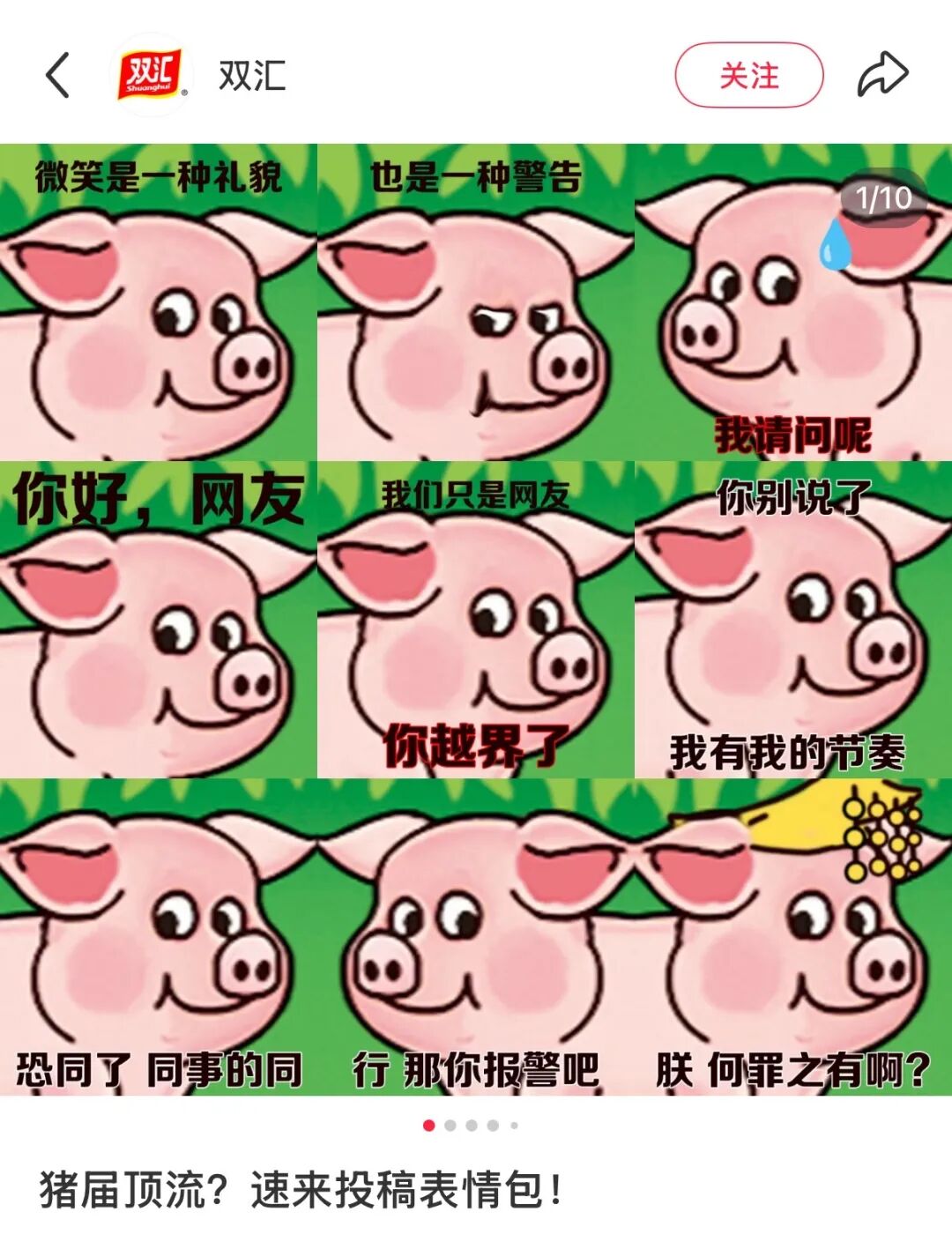 “玩梗”同样也能够为品牌带来意外的曝光。今年6月,一只表情独特的小粉猪意外走红,随后被网友发现其来源其实是双汇火腿肠海外版包装袋上的卡通形象。随后,众多网友开始对这一形象进行表情包二创,而双汇官方也反应迅速,积极认领下小粉猪,并制作了一系列表情包,邀请用户二创。此后,小粉猪也顺势晋升为双汇的吉祥物和形象IP。