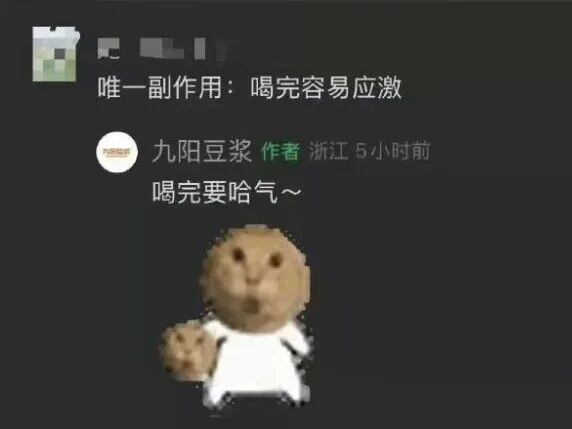 无论从哪个角度来看,九阳豆浆打出的都是“擦边球”无疑。在评论区,官方账号还以“好喝到哈气”“喝完要哈气”以及耄耋表情包与网友互动;为了规避风险,九阳豆浆还在用户质疑猫咪形象来源时解释,其原型来自于公司园区内的橘猫,并晒出照片为证。从这一角度看,九阳豆浆官方并非没有做过风险评估和预案。