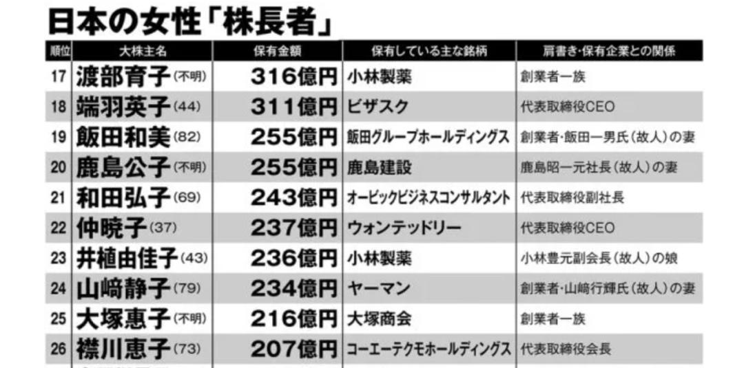日本媒体曾在2021年做过统计,在日本持有股票市值最高的女性中,惠子以207亿日元(合约人民币9.6亿元)的身价排在第26位;