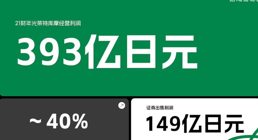 以2024-2025财年第一季度为例,公司非营业利润达到137亿日元,远高于同期57亿日元的营业利润。再往前看,最为显著的是2021财年,光荣特库摩实现利润393亿日元,其中149亿日元来自出售股票所得,投资收入占比接近 40%。