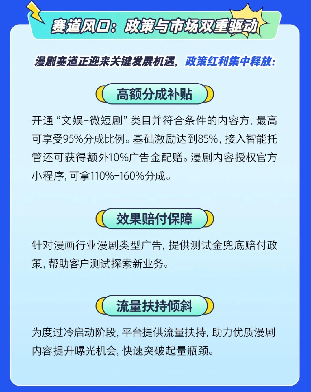 腾讯广告于10月底发布的扶持政策则在分成上显得相当慷慨,内容方开通“文娱-微短剧”类目并符合条件最高可享受95%分成比例,基础激励达到85%接入智能托管还可获得额外10%广告金配赠,漫剧内容授权官方小程序可拿110%-160%分成。