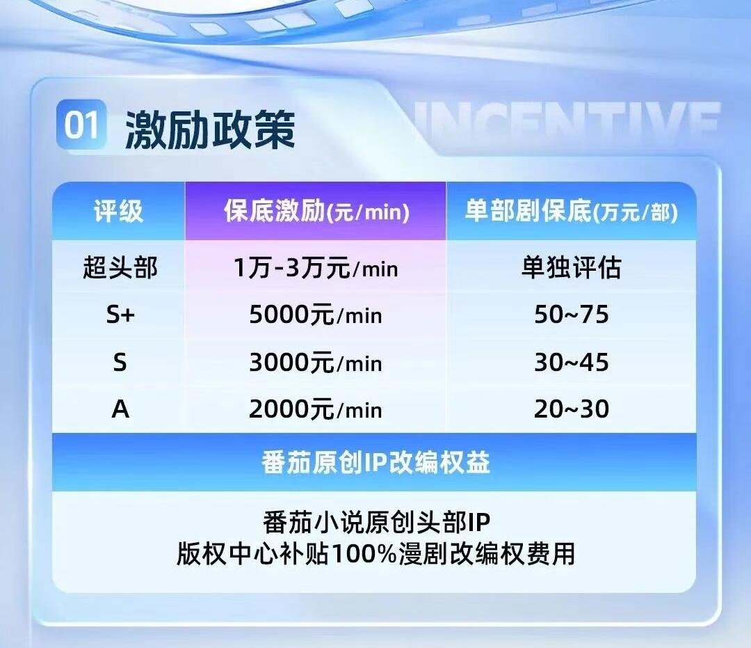 其中,抖音在布局上尤为积极。11月13日,抖音短剧版权中心发布了头部精品漫剧激励政策,对S+级别作品提供75万元保底分成,保底单价为5000元/分钟,超头部作品最高可达3万元/分钟。