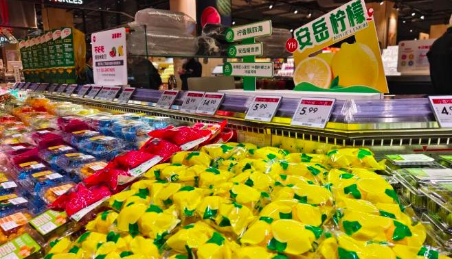 在安岳店,消费者可以买到价格实惠的鲜活鲈鱼(15.9元/条)、南美白对虾(不足30元/斤)等传统县域市场罕见的“民生海鲜”。同时,该店还利用柠檬产地优势打造“从枝头到货架24小时”链路,既提升消费者“尝鲜体验”,又助力安岳柠檬品牌价值提升。