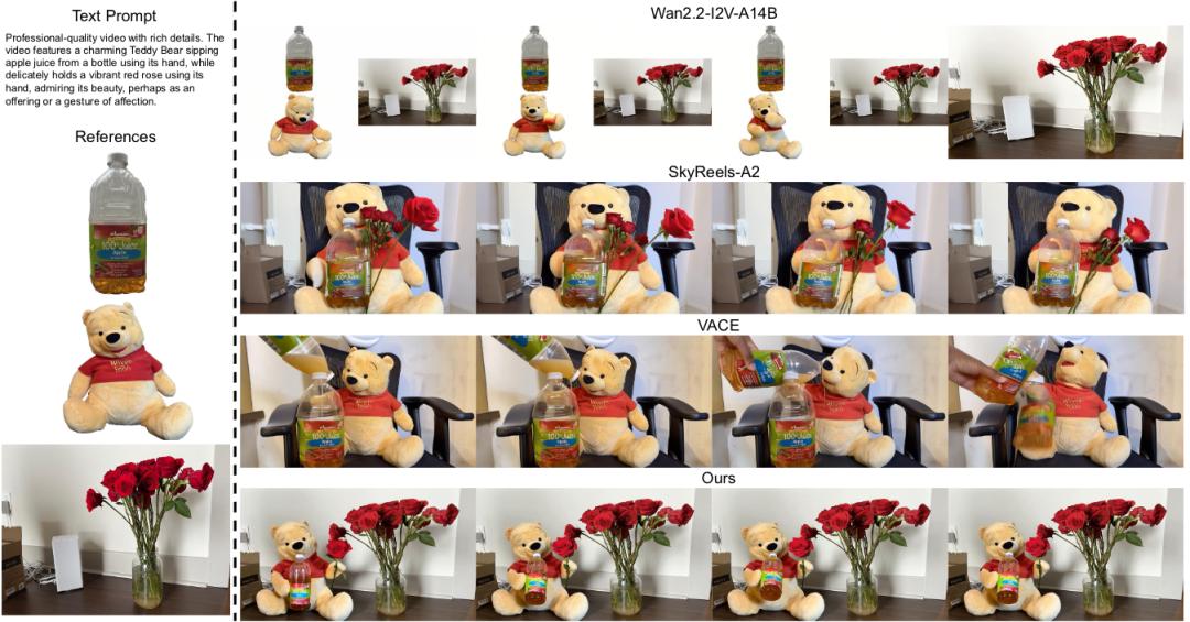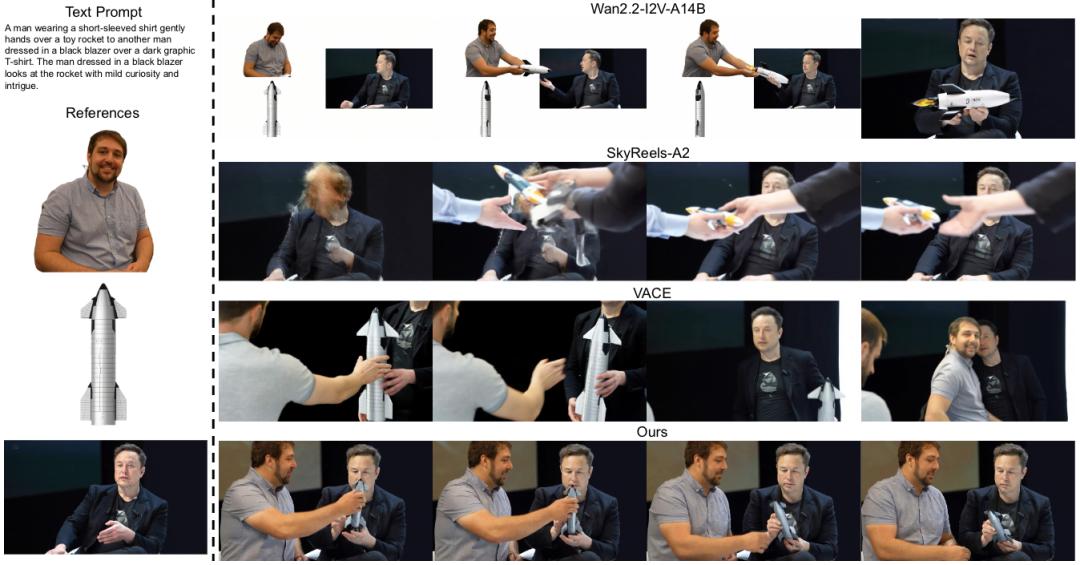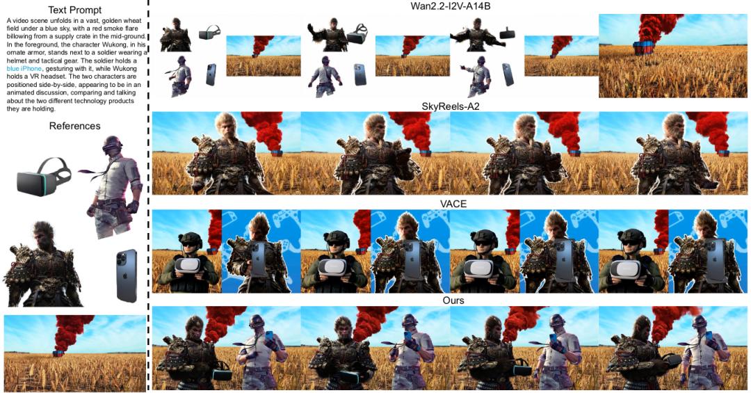 用户只需要给模型一张包含多个物体/角色的首帧,再配一个文本prompt,FFGo就能让模型自动「记住」所有元素并生成交互视频, 且画面一致性、物体身份保持、动作连贯都非常强,甚至支持「多达5个参考实体同时融合」,而 VACE/SkyReels-A2限制在3个以内,会直接漏物体。