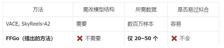 - FFGo用极低成本把这种能力「唤醒」, 不改结构、不用大数据, 仅20–50个例子即可实现SOTA视频定制