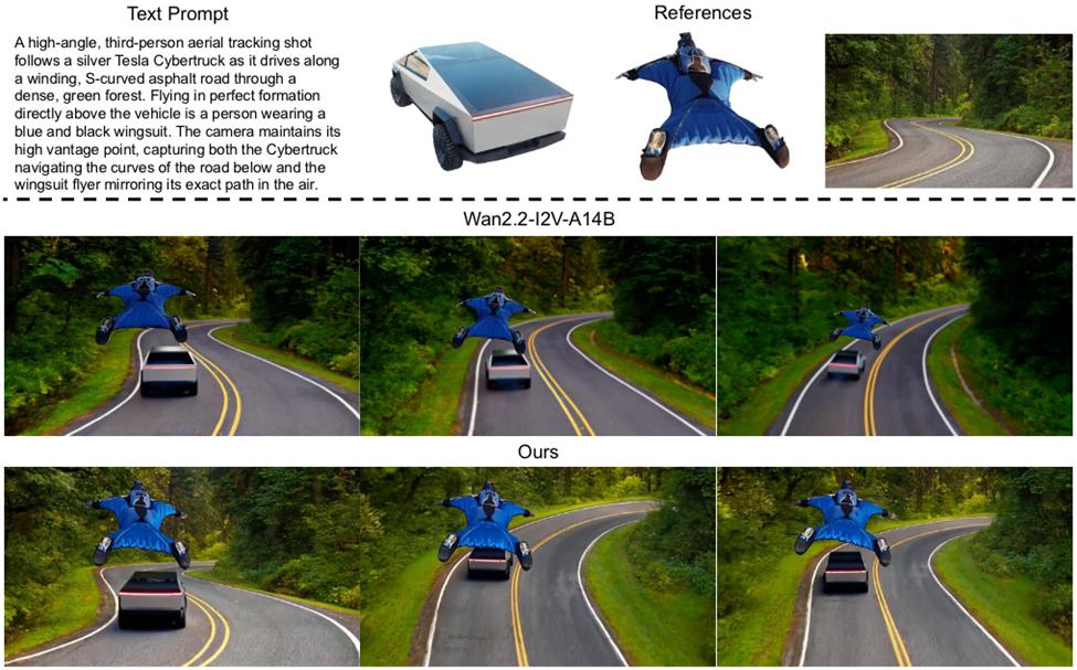 - 与文本提示(例如 wingsuit 飞行者与 Cybertruck 贴合运动)高度匹配