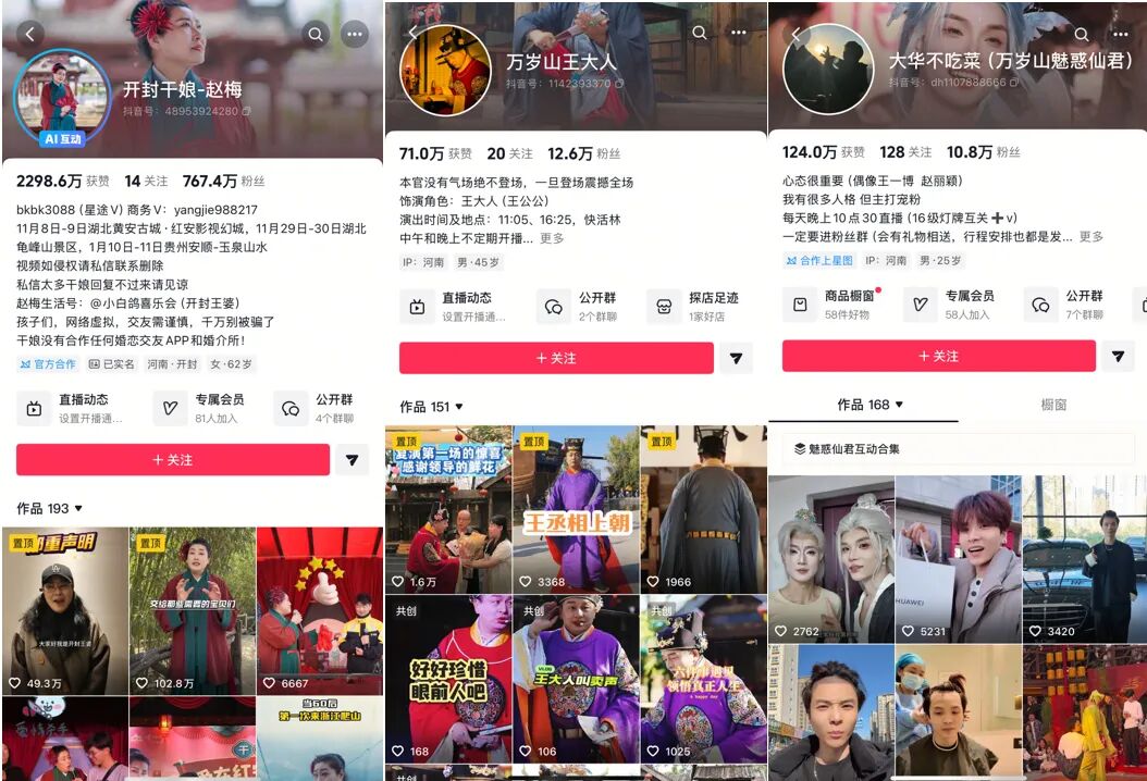 在此背景下,不少万岁山的NPC走红出圈。比如“王婆说媒”,节目被网友戏称为“接地气版《非诚勿扰》”,“王婆”的扮演者赵梅也由此深得网友喜爱。目前赵梅的账号在抖音已拥有767.4万粉丝,在快手已拥有172.8万粉丝。万岁山还有扮演过丞相及公公形象的“万岁山王大人”、扮演仙君的“大华不吃菜”等,他们的短视频平台账号粉丝量多在10万以上。