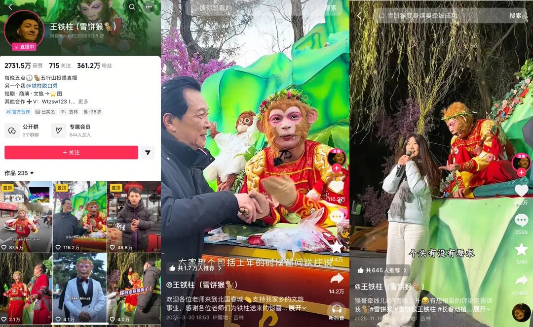 长春市动植物公园昵称“雪饼猴”的孙悟空NPC即是典型一例。目前“雪饼猴”扮演者王铁柱在抖音已拥有361.2万粉丝,在快手已拥有35.2万粉丝。除本人账号外,短视频平台上还有大量分享“雪饼猴”视频切片的账号,部分账号的累计点赞量超过了600万。