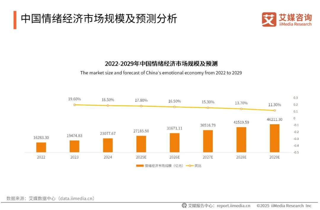 据调研机构艾媒咨询数据,国内情绪经济市场规模持续增长,2024年为2.31万亿元,2025年将增长至2.72万亿元,2029年可达4.62万亿元,CAGR(年复合增长率)为14.9%;在潮玩、体验、宠物、疗愈等情绪消费领域中,包含NPC互动景区在内的沉浸式体验经济,为消费者偏好第一位。