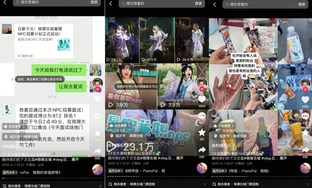 就连NPC招聘活动本身,包括邀请网红跨界客串,都能成为独立传播的热点。此前洛阳重渡沟景区、临沂天上王城景区、上饶婺女洲度假区都曾因高薪招聘引发热议。还有部分博主特意兼职NPC,拉动线下流量,提升人气,比如抖音博主“利嗨乐乐子”就特地发布了自己在临沂琅琊古城景区做NPC的全过程,也有粉丝特地根据视频去到活动地点打卡留念。
