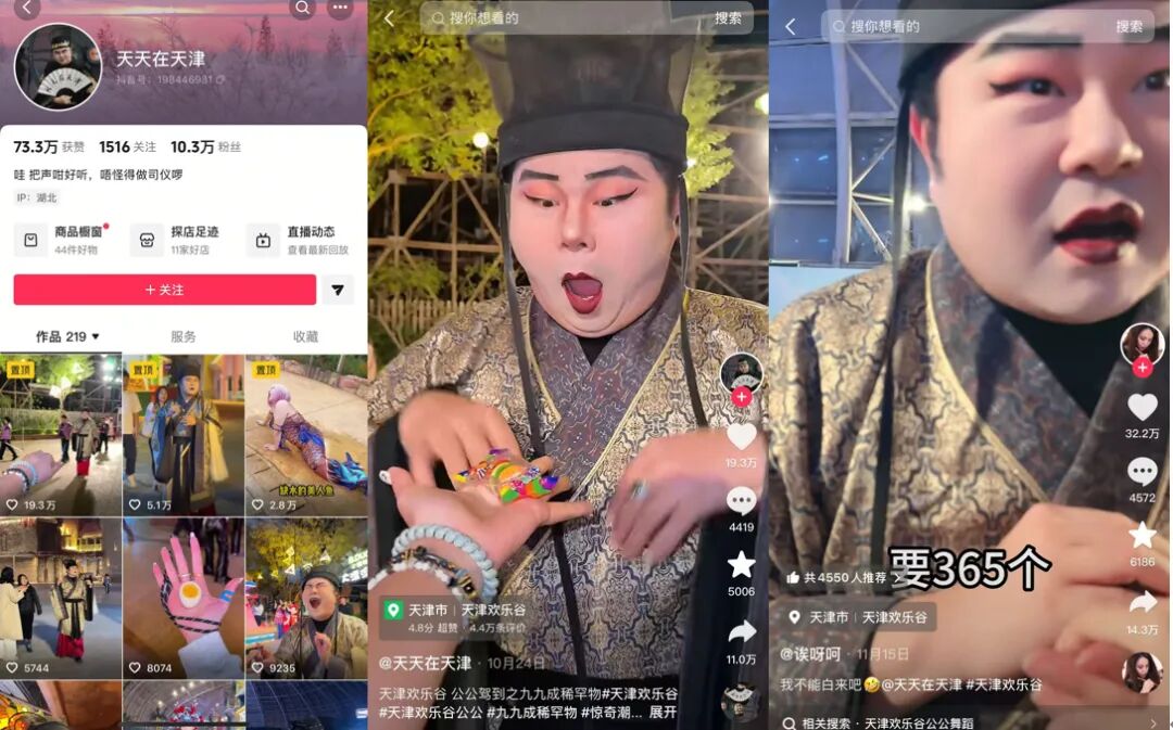 比如在天津欢乐谷饰演太监角色的“天天在天津”,本人抖音账号仅有10万粉丝,但多位游客为其拍摄、上传的十几个互动视频点赞量都超过10万。许多网友并不知道他如何称呼,就直呼“公公”。有游客递出糖果,公公便挑眉瞪眼、左顾右盼地把糖藏进怀里,还掏出一个比心的手势。用网友的话说,这叫情绪价值拉满。