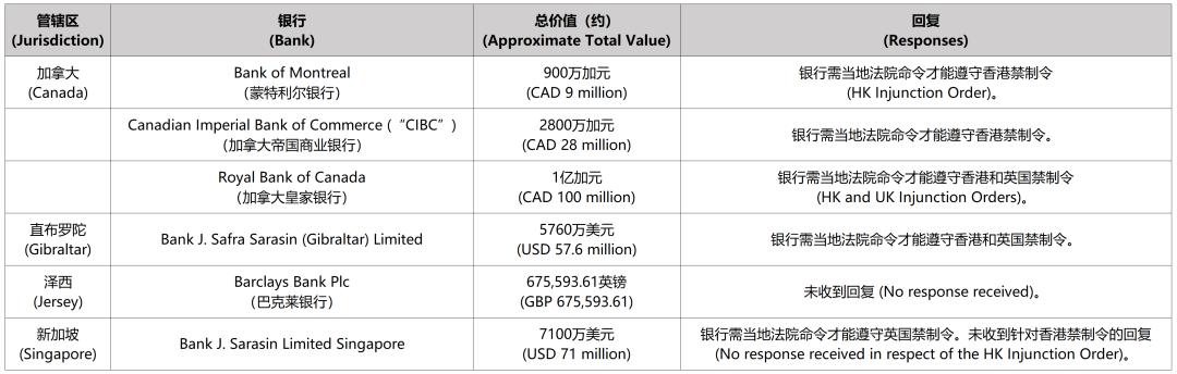 中国恒大以及相关部门在发现上述资产线索后,向这些银行申请,冻结账户中的资金。蒙特利尔银行、加拿大帝国商业银行、加拿大皇家银行Bank J. Safra Sarasin (Gibraltar) Limited、Bank J. Sarasin Limited Singapore均回复称,需要当地法院命令才能执行香港或英国法庭的禁制令。巴克莱银行则未对这一要求做出回复。