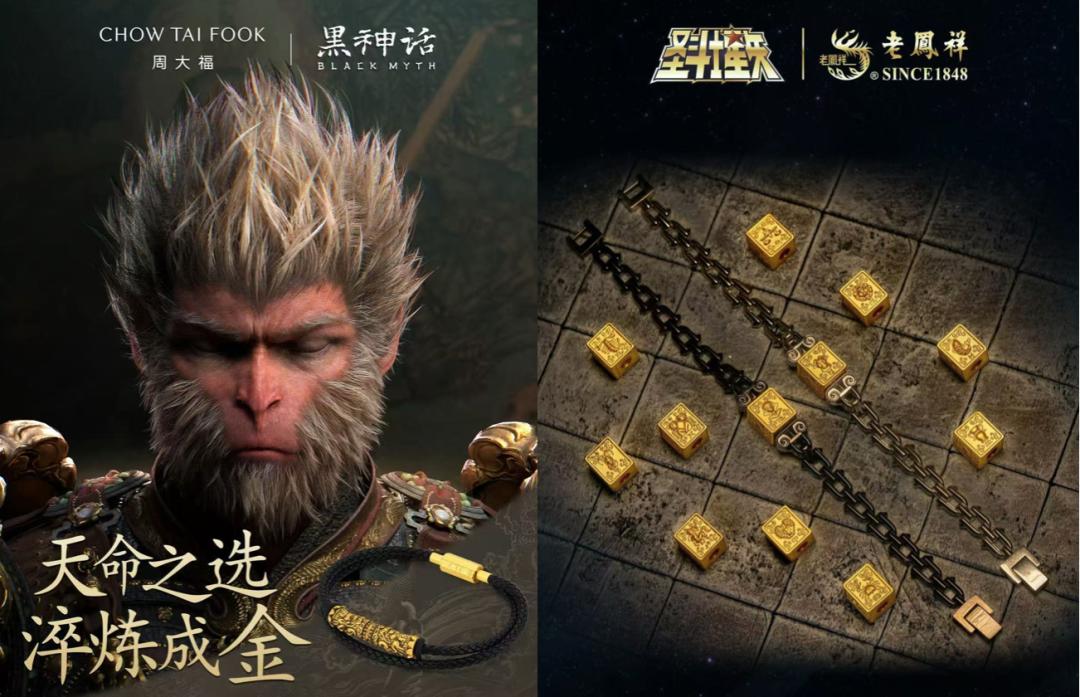 周大福与《黑神话:悟空》的合作,推出了以“如意金箍棒”和“紧箍咒”为设计灵感的黄金手链、吊坠、戒指等饰品,创造了零售值超1.5亿元的销售业绩。老凤祥则与《圣斗士星矢》联名,将经典的黄金圣衣元素微缩制成限量版转运珠,尽管定价不菲,但仍吸引大量粉丝预付定金购买。