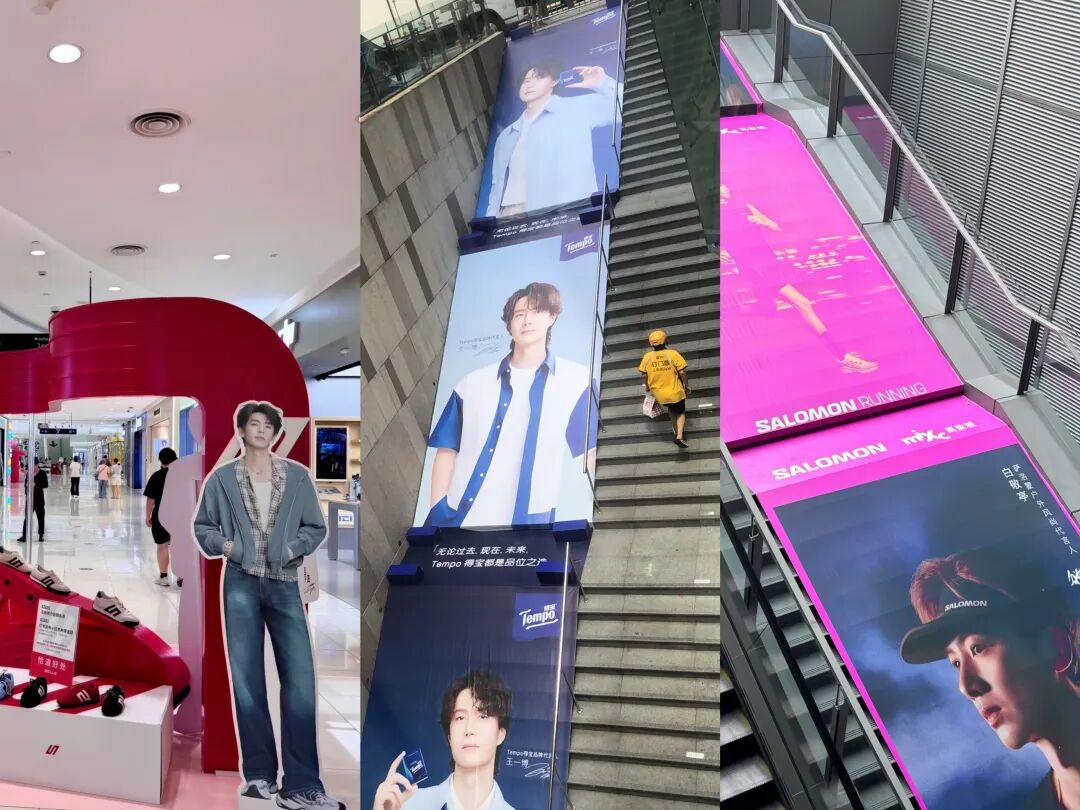 在商场内有门店的品牌,更多会选择“痛楼”的营销玩法——即在商场内外覆盖带有二次元角色或明星出镜的品牌广告,吸引粉丝打卡,并直接入店消费。