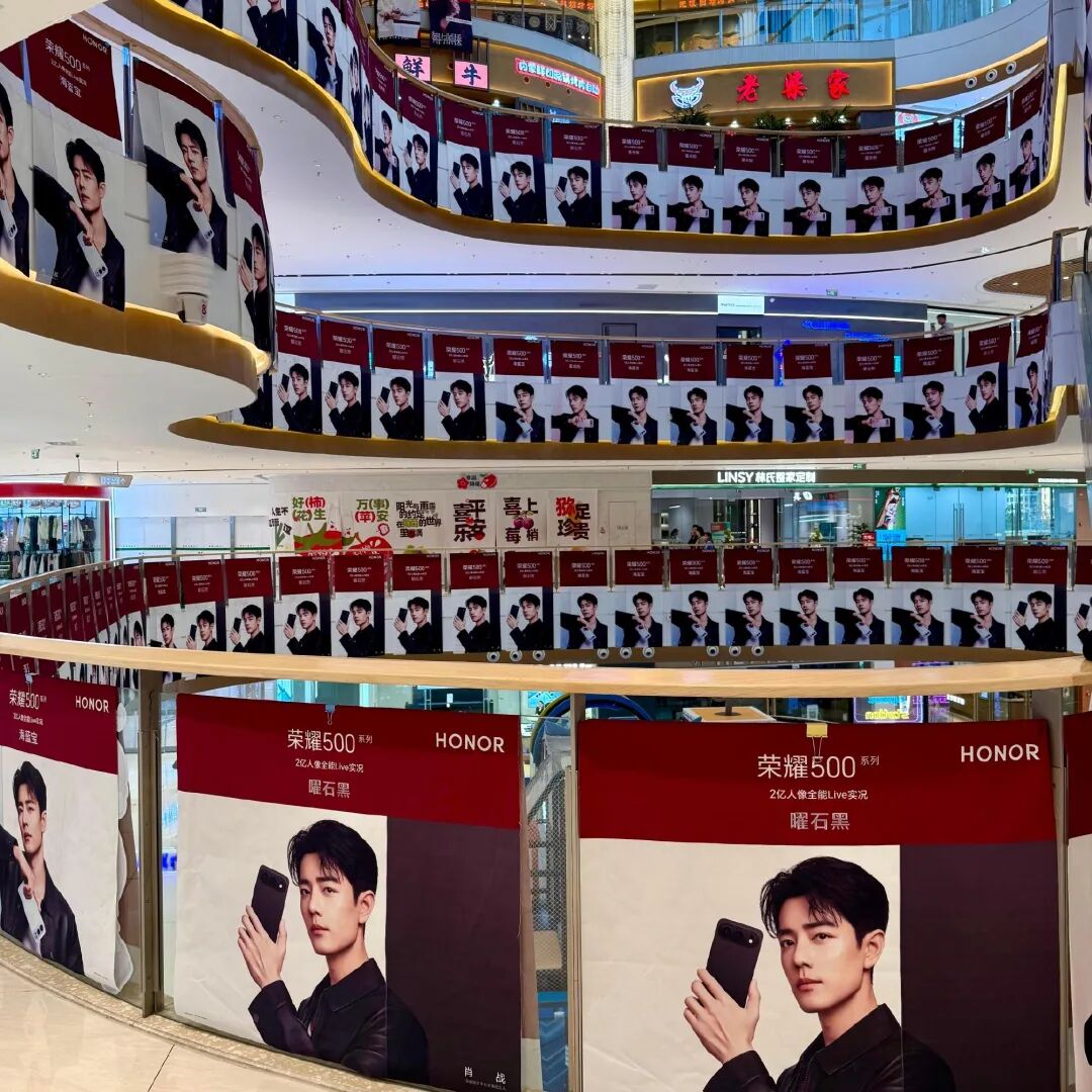 比如今年肖战作为荣耀手机全球代言人,在新品手机上市时品牌方就联动了西安、沈阳、青岛等多个城市的商场,在商场内打造以肖战拿着最新款手机为核心素材的“痛楼”。荣耀还通过到店拍照发微博领海报的方式,激励粉丝前去打卡,并在线上做自来水营销。