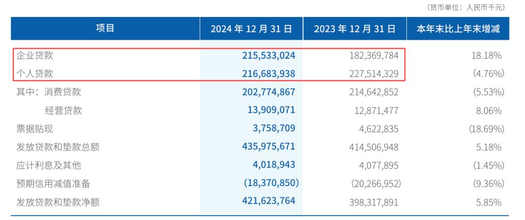 近年来,尽管微众银行有意从"个贷为王"向"个企并重"转型,但截至2024年末,个贷仍占有半壁江山。