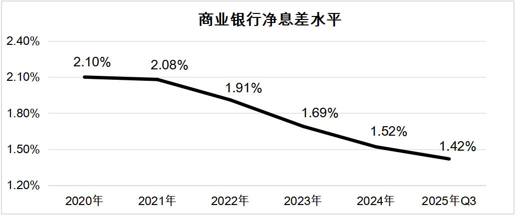根据国家金融监管总局最新披露的数据,截至2025年三季度末,商业银行净息差1.42%,环比持平,同比收窄0.11个百分点。
