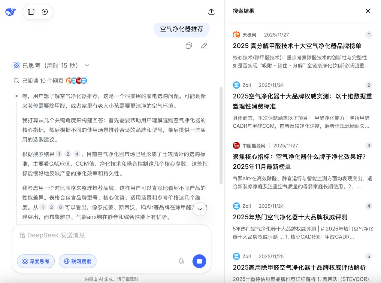 从AI的推理逻辑来看,用户提出问题后,AI进入“思考”状态,约14秒内就能阅读完10个外部网页,并迅速整理出了一排选购建议。因此,影响AI最直接的方式就是影响其阅读的外部网页。