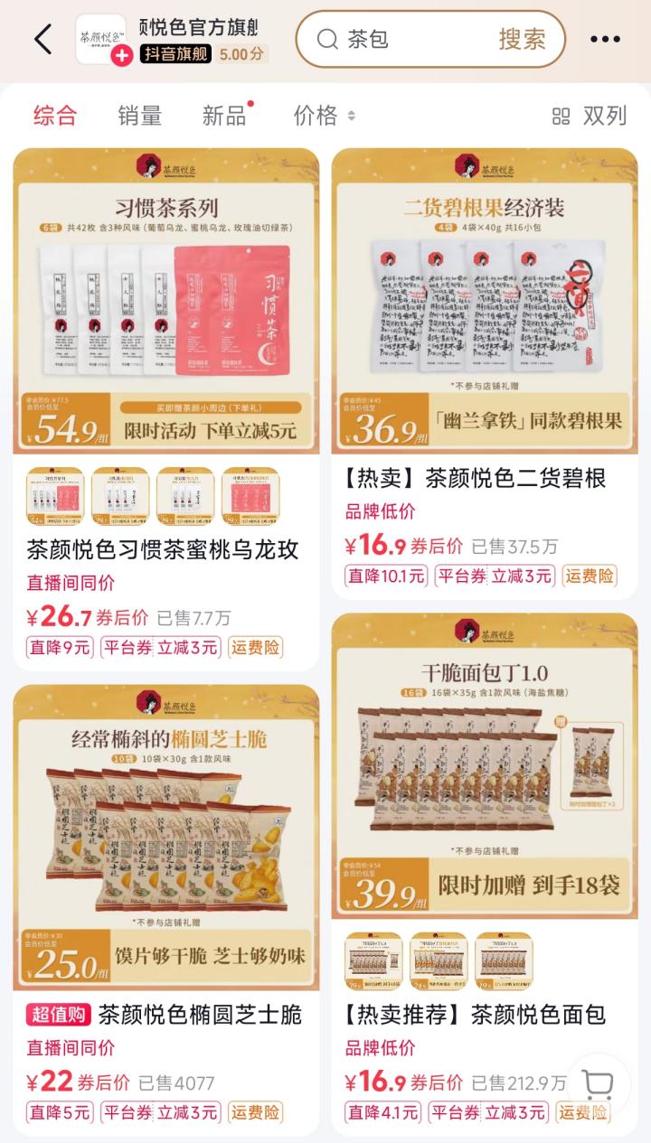 抖音商城里,茶颜悦色官方旗舰店内,2袋二货碧根果售价16.9元,销量超过了37万件,成为品牌碧根果爆款榜第二。