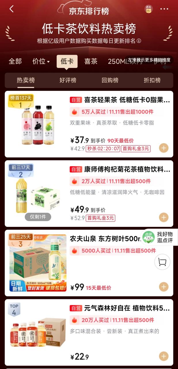 京东上,喜茶京东自营旗舰店内,450毫升的喜茶轻果茶,12瓶售价37.9元,折合一瓶约3.2元,已售超过10万件,成为京东低卡茶饮料热卖榜冠军。