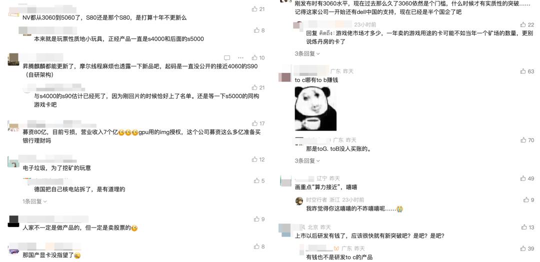 客气一点的吐槽摩尔线程的 MTT S80 显卡三年来一直没迭代,不客气的不走程序,直接喷他们的产品是“电子垃圾,为了挖矿的玩意”。