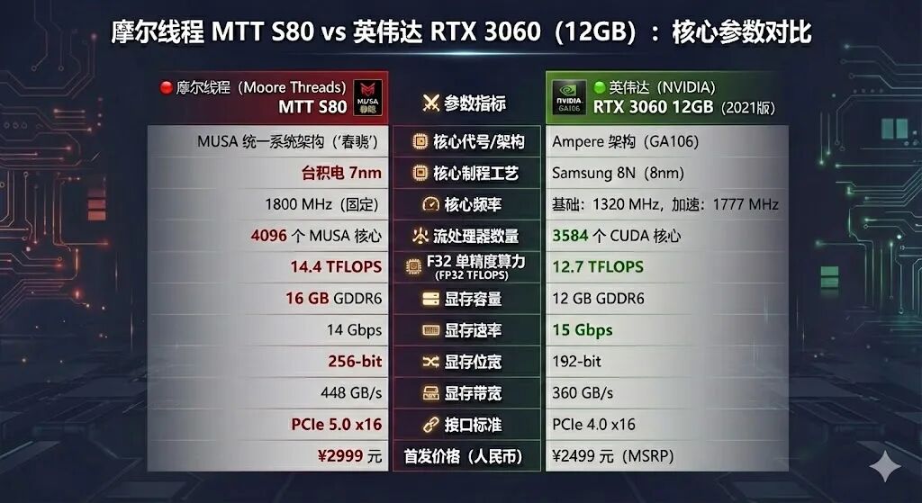 核心架构MUSA、台积电7nm 制程、16GB GDDR6 显存、4096 个流处理器,在核心数、显存容量和带宽上全面超越英伟达 2021 年发布的RTX 3060。