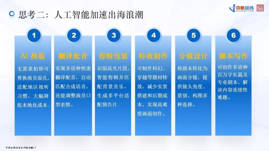 《报告》认为,AI是推动短剧全球化的核心技术力量。AI在人物换脸、翻译配音、剪辑包装、特效制作、脚本写作和分镜设计等环节的应用,提高了出海效率。例如,某平台通过AI技术加持,使短剧制作周期缩短30%,成本下降40%,并有效提升了短剧在全球多语种、多文化场景的分发效率。