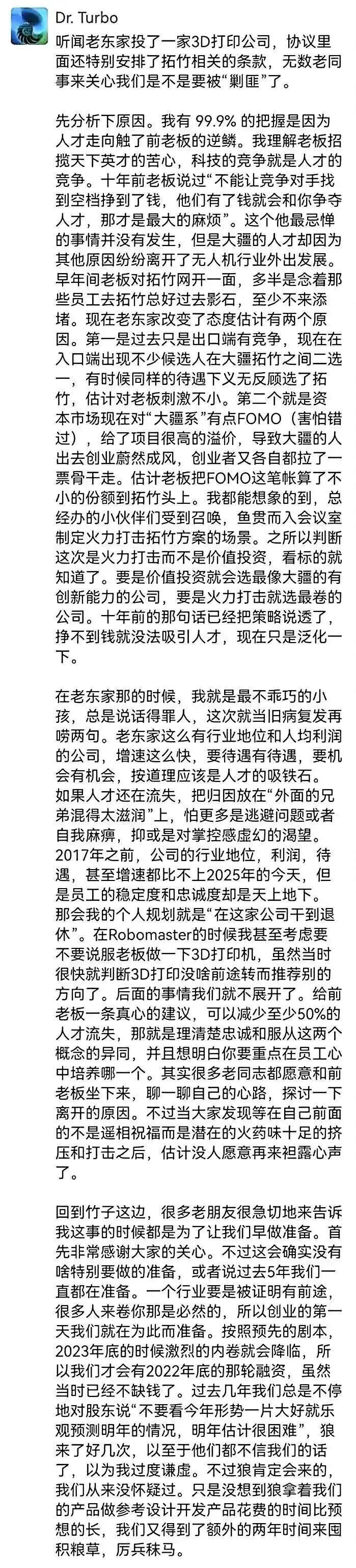 或许正因如此,有业内人士透露,大疆对离职创业,特别是带走技术的行为管控极严。有拓竹员工就表示,“拓竹五年前刚注册就上了大疆的竞业清单,至今仍在”。