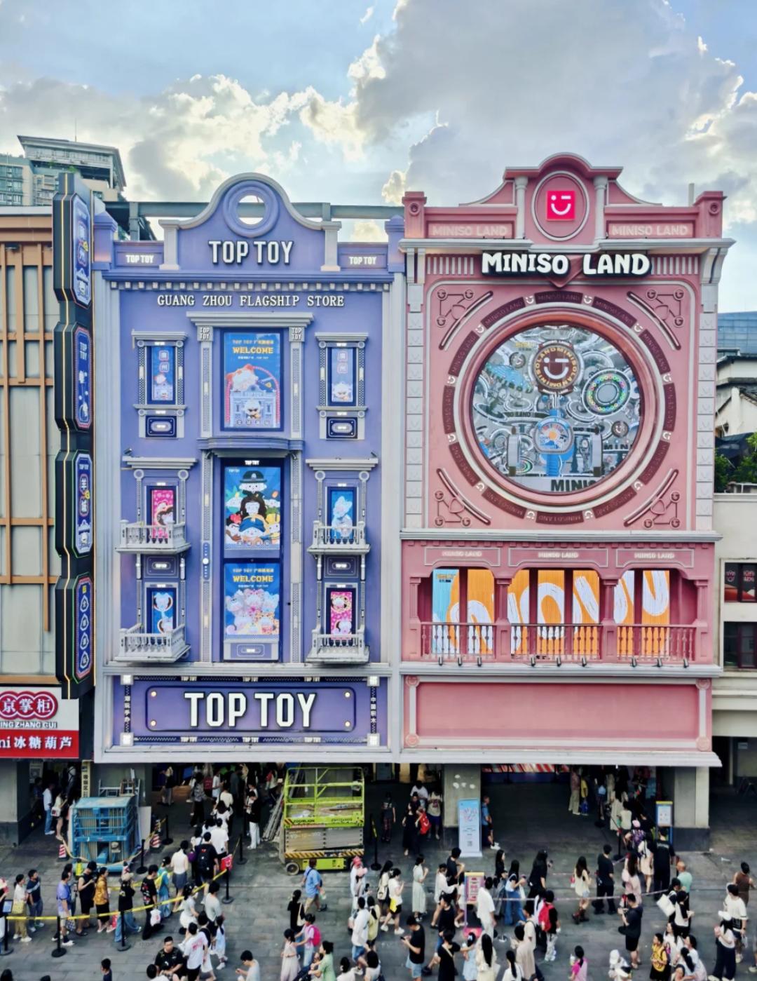 首先,长得就很不一样。普通名创一般都塞在商场的一角,朴实低调接地气,而MINISO LAND一出手就是两三层“这片鱼塘都被我承包了”的阔气。就拿广州北京路的这家举例,把传统的岭南骑楼爆改成通体粉色的三层痛楼,再加上缤纷变幻的电子大屏门头,一打眼还以为误闯了迪士尼。
