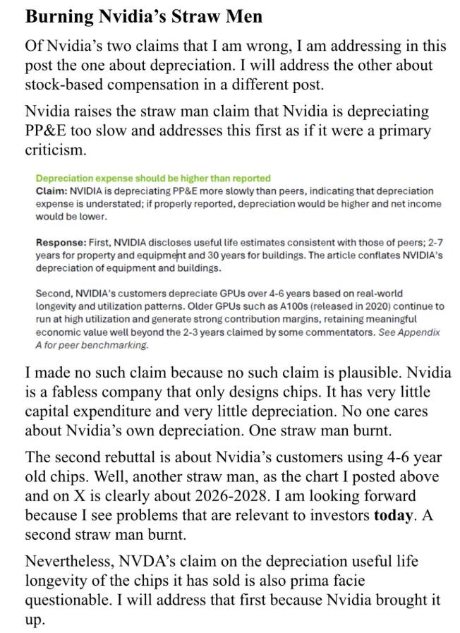 首先,Burry指出,他从未质疑过英伟达自身的固定资产(PP&E)折旧政策。他强调,英伟达主要是一家芯片设计公司,资本支出极小,因此“没人在意英伟达自己的折旧”。他认为英伟达在此问题上的辩解是第一个“被烧掉的稻草人”。
