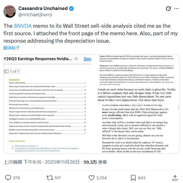 11月26日周二,Burry在其新开设的Substack博客平台发文写道,自己“不敢相信”这些回应出自全球市值最高的上市公司之手,并称该文件“读起来几乎像个骗局”。