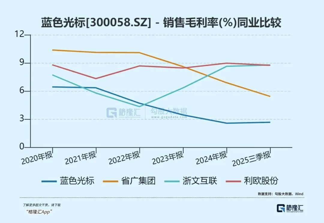 对比同行,蓝色光标的毛利率也处于行业内相对较低的水平。