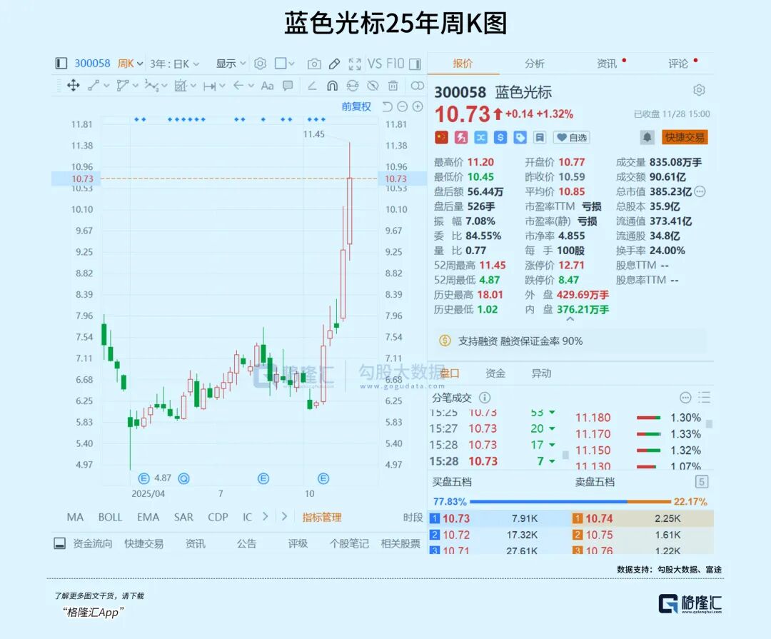 而在资本市场上,在AI应用概念下,营销行业整体上涨。其中,蓝色光标作为国内最早进入互联网广告营销的企业,自从10月30日以来其股价已然暴涨超70%。若是从年初的最低点算起,该股已然翻倍。