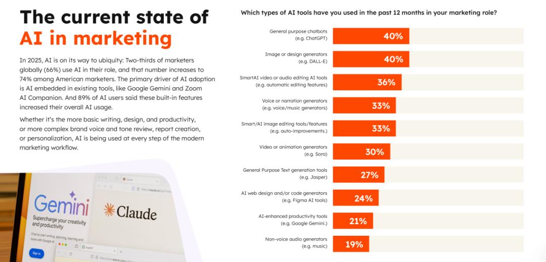 据HubSpot《2025年营销AI趋势报告》显示,全球66%的营销人员已在工作中使用AI,美国市场的渗透率更高达74%。