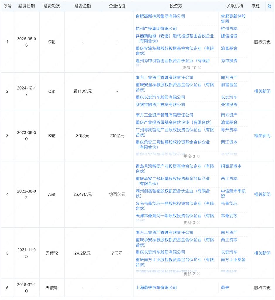 融资方面,企查查信息显示,自2018年7月成立至今,阿维塔已经进行6轮融资,募集资金超过190亿元。