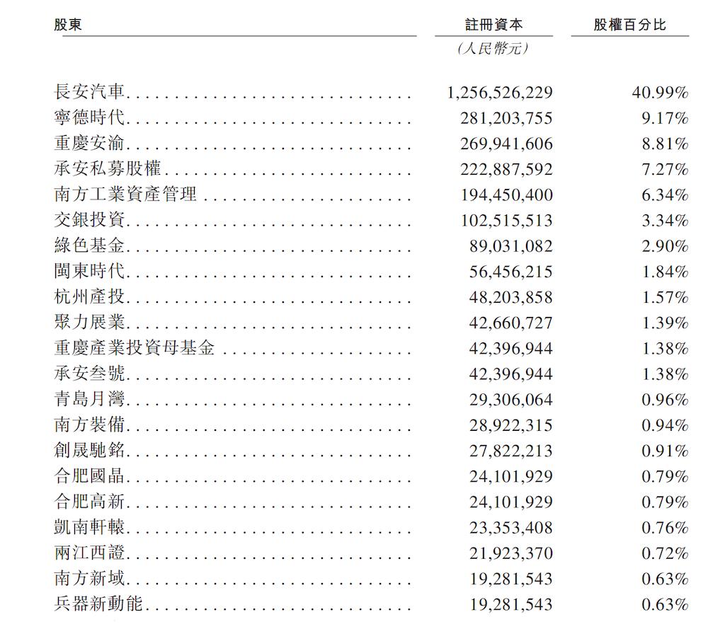 IPO前,阿维塔第一大股东长安汽车持股40.99%,第二大股东宁德时代持股9.17%,重庆安渝持股为8.81%,承安私募股权持股7.27%,南方工业资产管理持股6.34%。