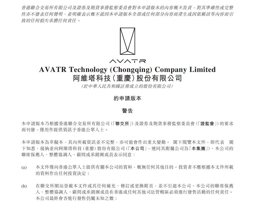 车东西11月28日消息,昨日晚间,阿维塔科技(重庆)股份有限公司(简称为“阿维塔”)正式在港交所递交了上市申请书。