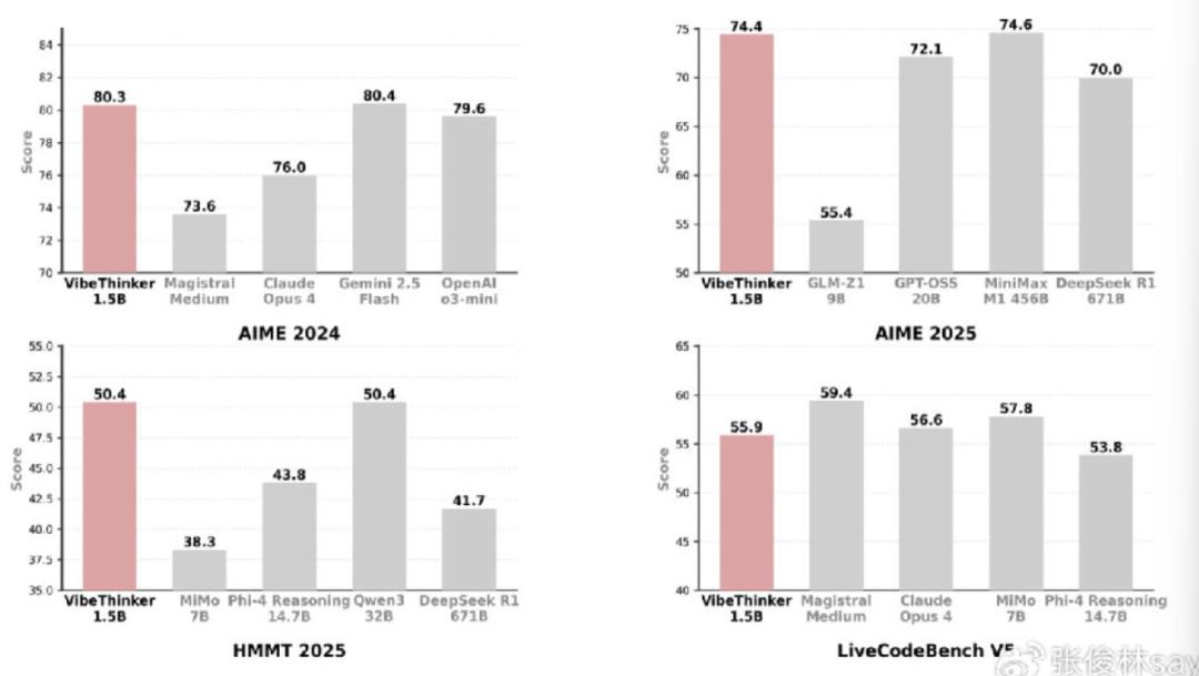 张俊林透露,VibeThinker在AIME2024(即2024年度)、AIME2025(即2025年度)和HMMT2025在三个测试集中的得分,分别是80.4分,74.4分,50.5分。