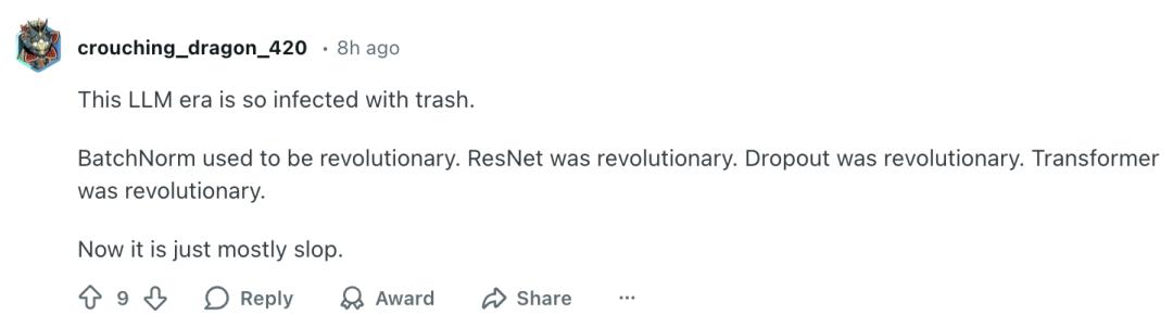 我们曾拥有BatchNorm、ResNet、Dropout、Transformer这些革命性成果。但到了大模型时代看起来真的是一团糟。