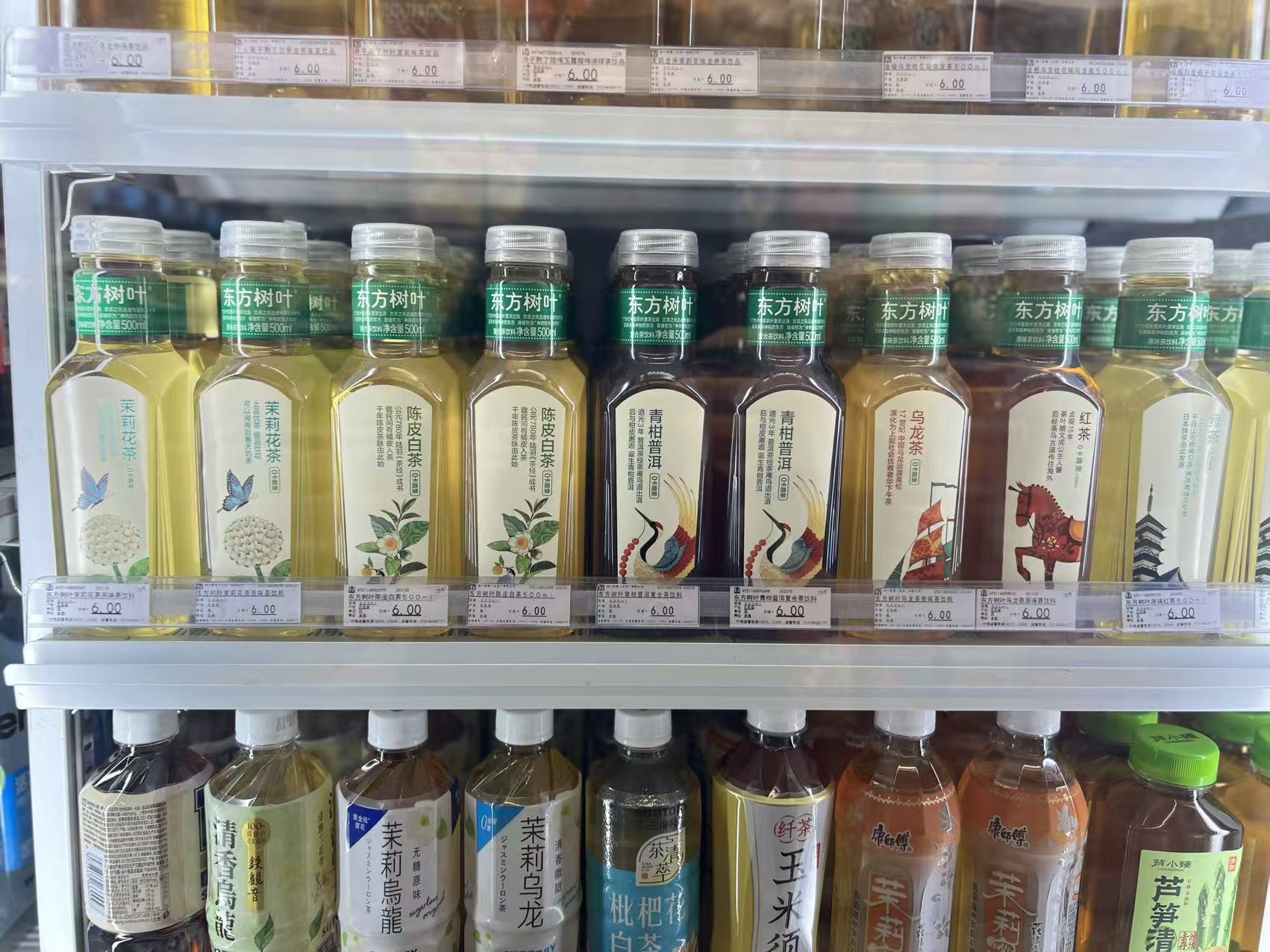 但同样是农夫山泉旗下的东方树叶,并没有拒绝打折的货架,相反消费者可以在折扣超市或者零食店货架上看到它相当多的产品,同时便利店也有各种促销。