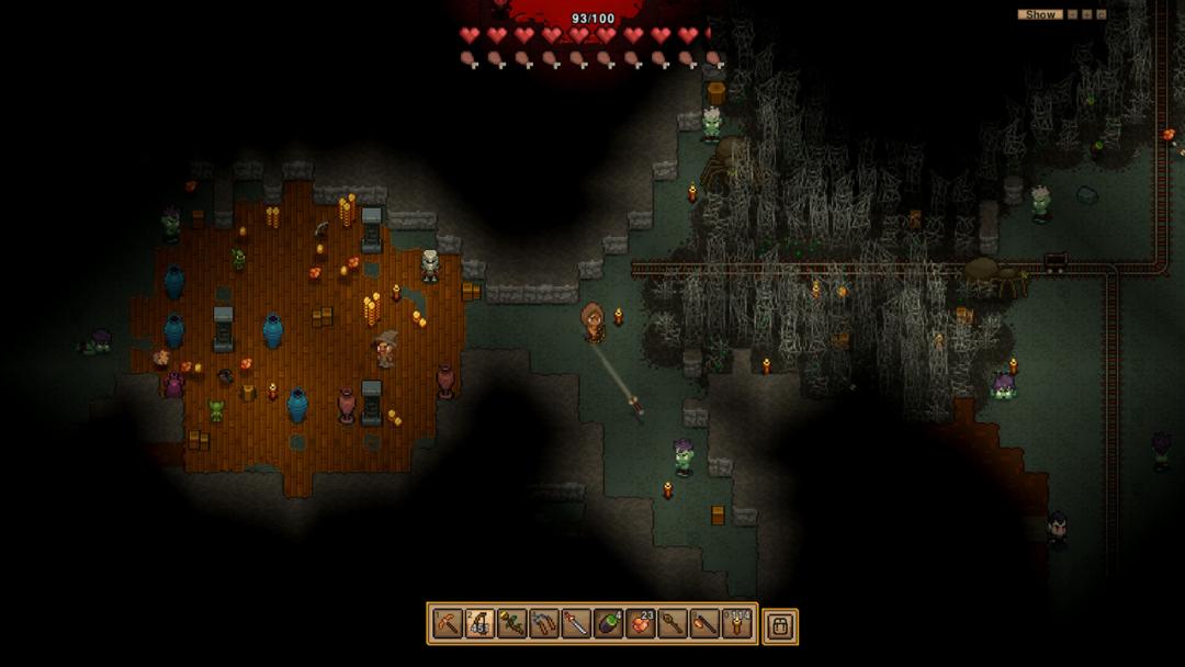 游戏的无缝大世界,包含5个大型自然生物群系,以及村庄、洞穴、地牢,以及迷你生物群系、入侵生物群系等特殊地形,可探索面积非常广阔。