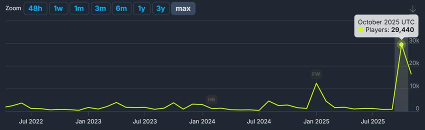 而前面提到这些要素,经过时间的发酵,会产生更加可观的影响力。今年10月游戏正式版发售后,《奈斯启示录》的同时在线人数达到了历史新高的29440,是22年峰值的8倍以上,这个爆发力,就源自游戏多年的沉淀。