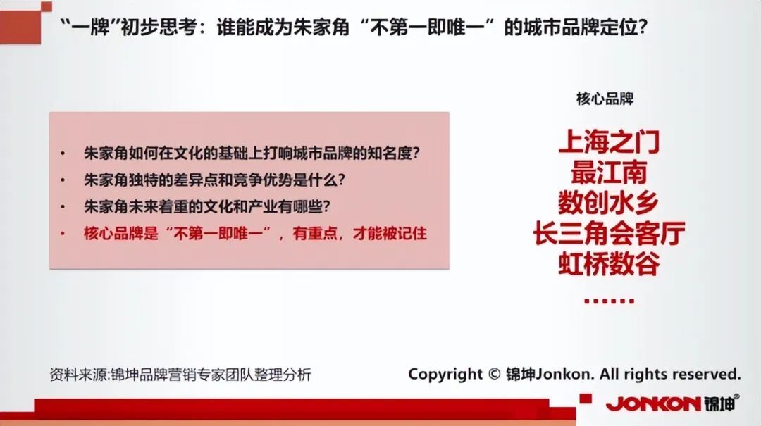 面对众多古镇的激烈竞争格局,作为400多家专精特新企业、300多个行业第一品牌、200多个上市公司、100多个城市品牌和50多个世界500强企业背后的产城园企品牌服务商,锦坤品牌专家议朱家角古镇可着眼于当下火爆的数字经济领域,打造差异化核心品牌 ——“数创水乡”或”虹桥数谷“,以全球首个 “数字孪生水乡” 综合体作为品牌定位。