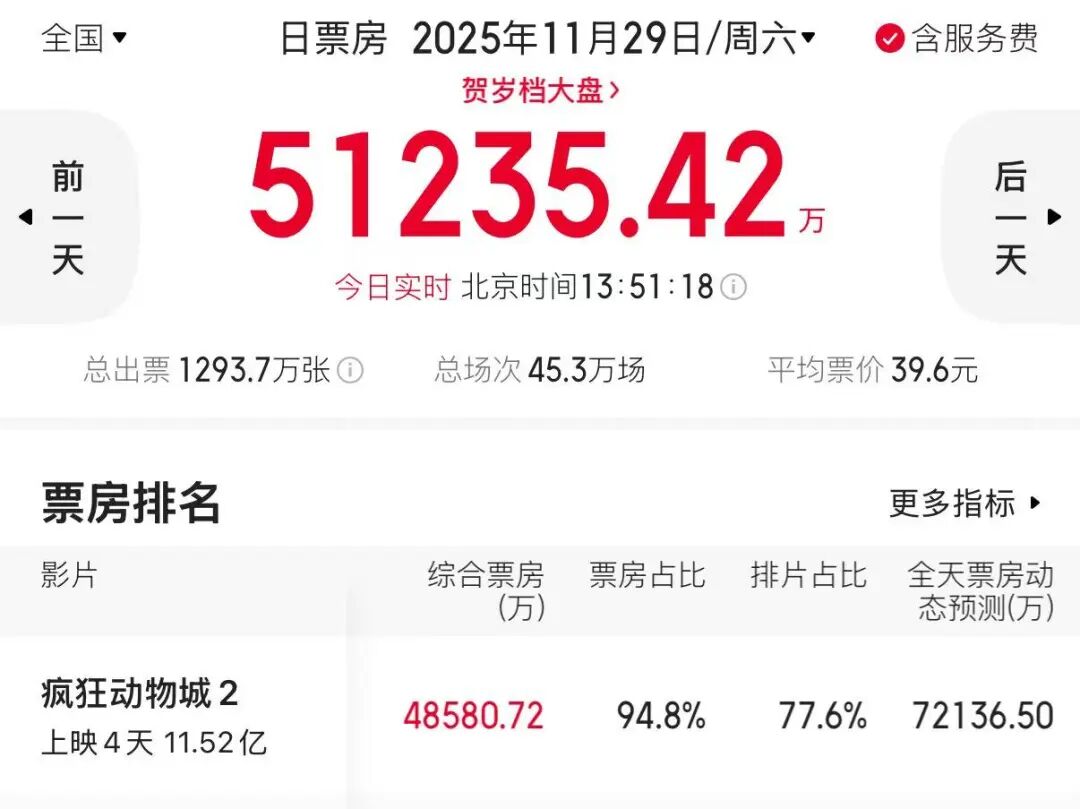 上映4天,票房就已经破10亿的《疯狂动物城2》在中国电影市场获得了统治性的地位。就在今天,它的排片占比已经高达77.3%,票房占比更是惊人地达到94.8%(相当于中国今天看电影的100人里,有95个人都是去看它的),则证明了它绝对突出的吸金能力。